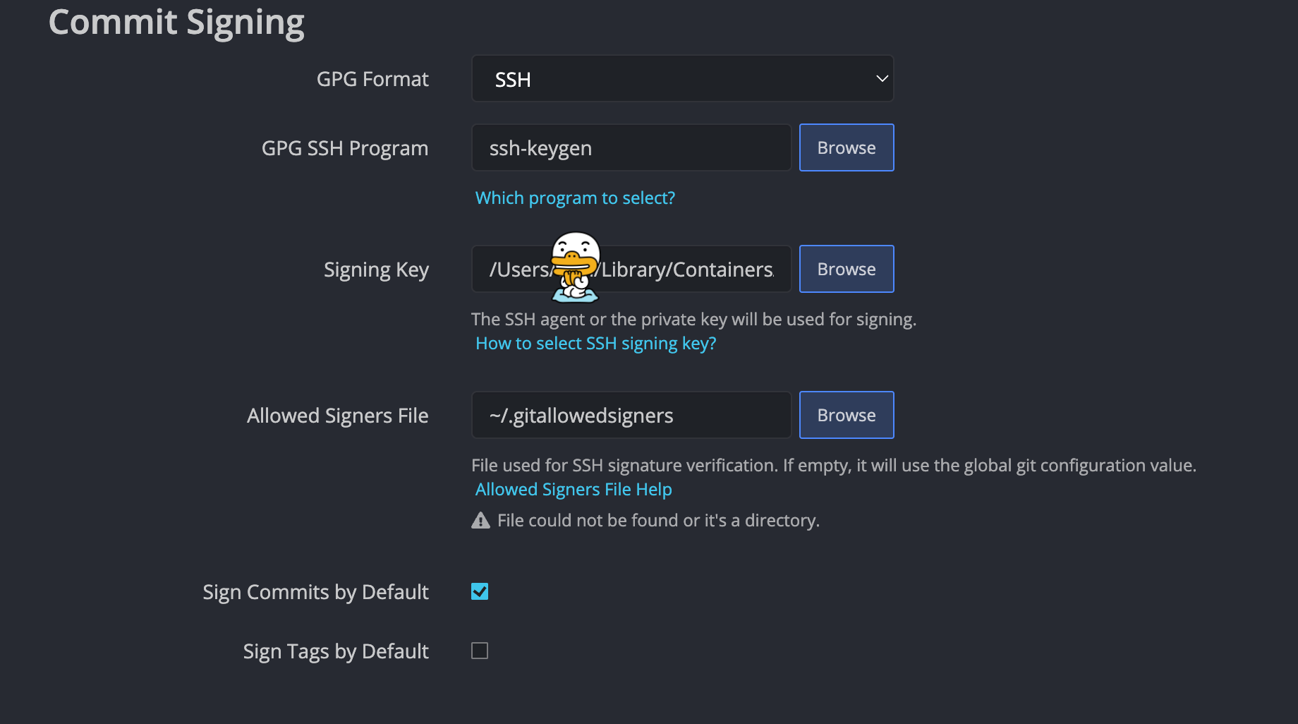 그리고 preference > commit signing 에서는 GPG ssh Program 을 ssh-keygen 으로 값 맞춰줌