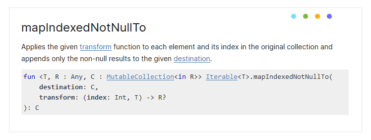 코틀린에는 map인데 자스처럼 몇 번째 원소인지 함수에 같이 전달해 주고(Indexed) 결과값이 NotNull인 것만 골라서, 목적 콜렉션에 추가해라(To) 너가 뭘 좋아할지 몰라서 모든 조합의 함수를 다 추가해 봤어^^인 언어임